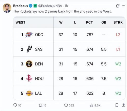 火箭在主场逆转灰熊后拿到二连胜,火箭28胜16负继续稳住西部第四,而西部第二的马刺31胜15负,火箭队距离西部第二只剩下2个胜场差。