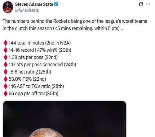 并且火箭队关键时刻各项数据均排在联盟垫底行列,开赛至今当比赛进入关键时刻时(最后5分钟,分差5分以内),火箭队战绩仅为14胜16负联盟第20。