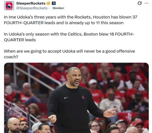 自从乌度卡执教火箭队至今,已经37次在末节领先情况下被逆转,本赛季已经11次末节被逆转,并且这样的表现并非偶然,在其执教凯尔特人唯一的一个完整赛季中,凯尔特人也曾18次在末节被逆转。