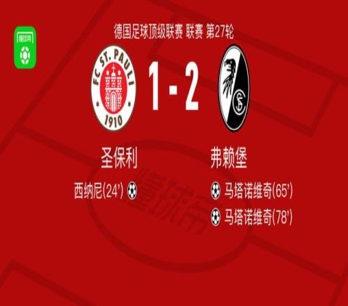北京时间3月23日德国足球顶级联赛 联赛 第27轮,圣保利主场对阵弗赖堡。圣保利西纳尼破门。弗赖堡马塔诺维奇梅开二度。最终比分圣保利 1-2 弗赖堡。