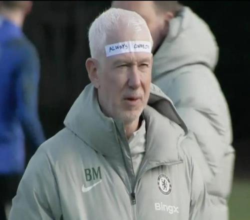 在切尔西今日的训练中,理疗师麦卡洛克的额头贴着一张纸条,写着“保持专注”,别致的造型吸引了人们的注意。